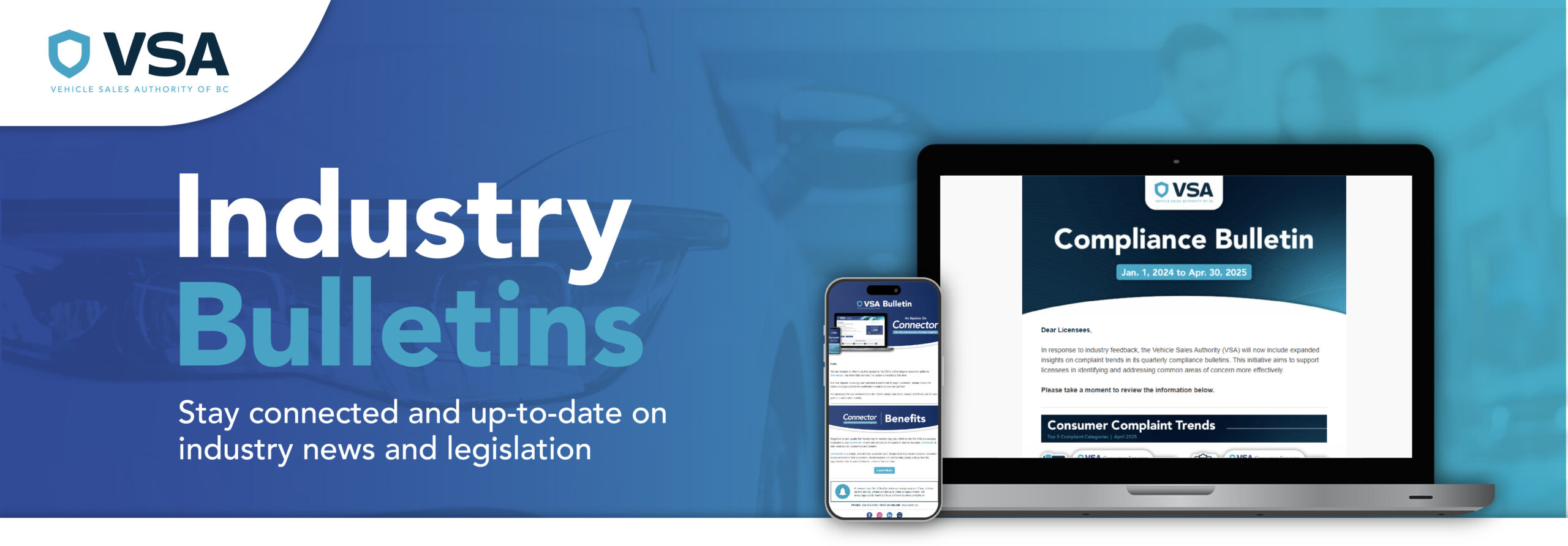 VSA industry communications feature regulatory updates, legislation updates and industry specific news, and are the primary source of communication between the VSA and the vehicle sales industry.