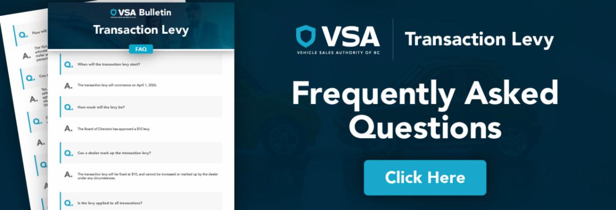 Effective April 1, 2026, the Vehicle Sales Authority of BC (VSA) will implement a fixed $10 Transaction Levy for each consumer transaction involving a motor vehicle, as defined under the Motor Dealer Act.